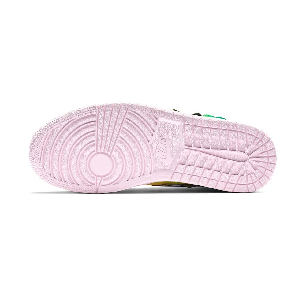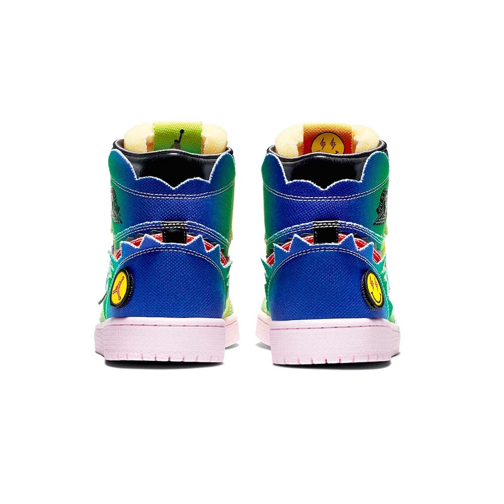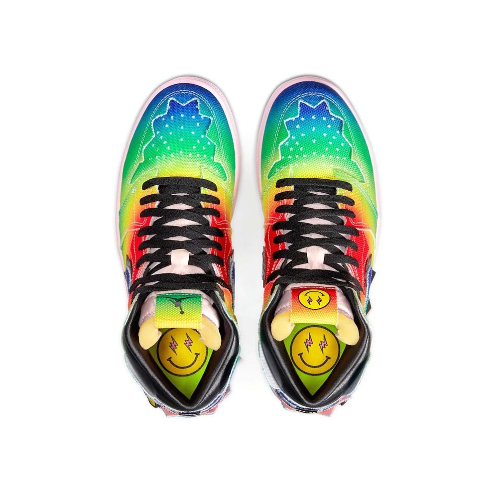 J Balvin x Air Jordan 1 High OG " Colores Y Vibras " は、人気ラテンアーティストとジョーダンブランドによる、マイケル・ジョーダン初のシグネチャーシューズのホリデー2020コラボレーションです。英語で「Colores and Vibes」と訳される「Colores Y Vibras」のリリースにより、コロンビア出身の彼は、ジョーダンブランドとコラボレーションした最初のラテンミュージシャンとなり、記念すべき偉業を成し遂げました。そのため、"虹 "のような色彩を持つキャンバス地をアッパーに採用。襟、アイレット、ヒール、前足部のギザギザしたパネルが、J・バルビンのデザインの特異性をさらに際立たせています。右足にはオレンジとブラックのJumpman、左足にはグリーンとイエローのスマイリーのパッチがあしらわれたタングタグがあしらわれている。